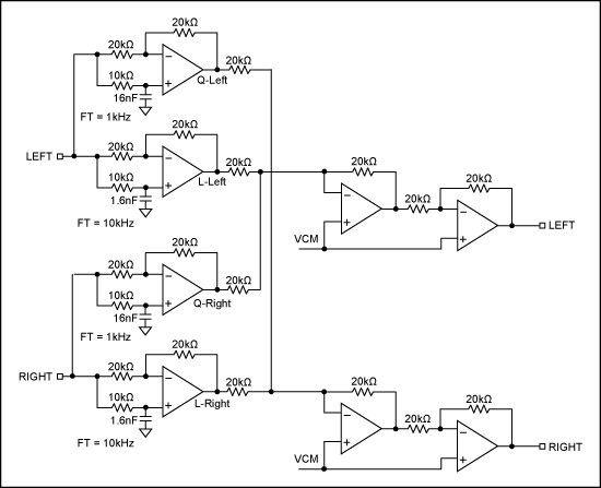 無源方案可以實現(xiàn)該電路,但是更通用的方法是有源電路(圖7)。對于線性信號(相應的輸入通道),電路呈現(xiàn)為一個ft=10kHz的相移濾波器,對于積分信號(另一路輸入),電路呈現(xiàn)為一個ft=1kHz的相移濾波器。目的是使線性輸入信號和積分信號之間在音頻帶寬1kHz至10kHz范圍內呈現(xiàn)90°相移。