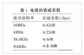 導(dǎo)線的電阻對信號的影響很小,可以忽略不計。電纜的分布電容C主要是由雙絞線的兩條平行導(dǎo)線產(chǎn)生。信號的損失主要是由于電纜的分布電容和分布電感組成的LC低通濾波器。通訊波特率越高,信號衰減也會越大。常規(guī)電纜的衰減系數(shù)見表1。