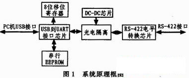 系統(tǒng)原理框圖如圖1所示。USB的一大優(yōu)點(diǎn)是可以提供500 mA的5 V電源,因此,設(shè)計(jì)時(shí)可以采用總線供電。信號(hào)通過(guò)FT4232H接口芯片,內(nèi)部處理后轉(zhuǎn)換成4路接口信號(hào)。4路相同的信號(hào),通過(guò)光電隔離后再經(jīng)過(guò)RS422電平轉(zhuǎn)換芯片轉(zhuǎn)換為RS422信號(hào)。光電隔離芯片是6N137,由于光電隔離左右端電源要求隔離,所以采用DC-DC芯片F(xiàn)0505S-1WR,電平轉(zhuǎn)換芯片采用的是SP491,8位移位寄存器采用的是SN74HCT595,主要是用來(lái)顯示各路的發(fā)送接收狀態(tài),而串行EEPROM采用的是93C46B,用來(lái)對(duì)數(shù)據(jù)進(jìn)行一定的存儲(chǔ)。