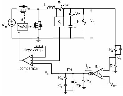 前面的討論知道:在每個開關(guān)周期,續(xù)流回路即低端的開關(guān)管流過的電流波形為下降階段的梯形狀波形。對于這種電流模式常稱為谷點電流模式。和峰值電流模式一樣,谷點電流模式反饋也有二個環(huán)路:一個電壓外環(huán),另一個是電流的內(nèi)環(huán)。其工作原理如下:高端的主開關(guān)管開通,電感激磁,電流線性上升;高端 MOSFET的導(dǎo)通一段固定的時間,此時間由 PWM 設(shè)定。當(dāng)高端 MOSFET 關(guān)斷后,低端MOSFET 導(dǎo)通,此時電感開始去磁,電流線性下降。注意到低端 MOSFET 的電流隨著時間線性下降,電流檢測電阻的電壓信號也線性下降,由于此時電壓外環(huán)的輸出電壓信號低于電流檢測電阻的電壓,電流比較器輸出為低電平。當(dāng)電流檢測電阻的電壓信號繼續(xù)下降,直到等于電壓外環(huán)的輸出電壓信號時,電流比較器的輸出翻轉(zhuǎn),從低高電平翻轉(zhuǎn)為高電壓,邏輯控制電路工作,關(guān)斷低端的續(xù)流開關(guān)管的驅(qū)動信號,高端的主開關(guān)管開通,此時電感開始激磁,電流線性上升,進入下一個周期,如此反復(fù)。