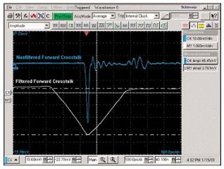 藍(lán)色波形是由白色波形濾波后減緩了脈沖上升沿得到的波形,它代表的就是對(duì)串?dāng)_進(jìn)行后濾波的結(jié)果。圖中顯示的紅色和藍(lán)色兩個(gè)串?dāng)_波形是以相同的電壓刻度顯示的。
