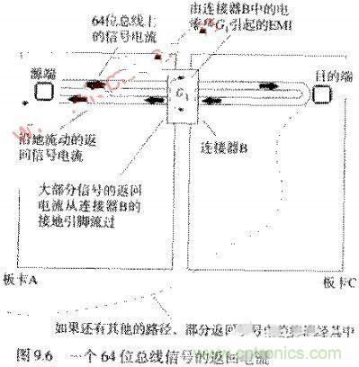 圖9.6舉例說明了一個普通的電磁干擾問題。一個64位總線從板卡A經(jīng)過連接器B連到母板卡上,母板卡可能是一個主CPU卡或是一個通往其他子卡的無源通道。64條信號線的返回電流從母板卡C流回板卡A,其中的絕大部分通過了連接器B的接地腳。