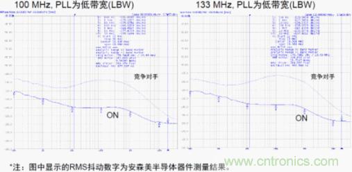 圖4:安森美半導(dǎo)體NB3N51034均方根抖動(dòng)性能明顯優(yōu)于競爭器件