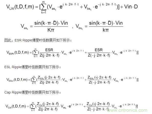 基于此因素,本文將以傅里葉函數(shù)(Fourier Series Expansion)方式來探討同步交換式降壓轉(zhuǎn)換器(Synchronous Step Down Converter)輸出電壓紋波的波形,并依電容完整等效串聯(lián)電阻(ESR)、等效串聯(lián)電感(ESL)、電容值(Capacitance)對應(yīng)的公式,經(jīng)由理論推導(dǎo),有效地分析電源模塊輸出端紋波成分。
