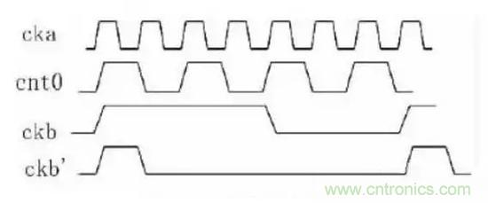為了方便討論,時鐘樹插入以后,假設(shè)A與B之間有1個ckaCycle的skew;從圖3可以看到如果采用A點(diǎn)作加法器的輸入時產(chǎn)生的波形是ckb’,采用B點(diǎn)作為輸入時的波形是ckb,顯然,從例1的代碼來看,ckb才是正確的。因此必須注意到,如果時鐘當(dāng)作普通的信號使用時可能帶來的問題,這類問題并沒有一個通用的解決辦法。在這個例子中,不采用時鐘樹上的信號才是正確的,但是在另外一些應(yīng)用中,就必須采用時鐘樹上的信號。比如,時鐘是CK的兩個觸發(fā)器中鎖存的數(shù)據(jù)再由CK的高電平和低電平選擇輸出,那么,這個時候就需要作為選擇信號的CK從時鐘樹上拉過來。因此,如果設(shè)計(jì)中用到了時鐘信號作為普通信號的情況,在后端設(shè)計(jì)時就必須特殊處理。