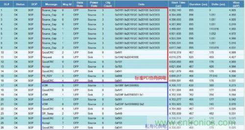 為了更加有效開發(fā)和準(zhǔn)確驗(yàn)證基于控制流程的協(xié)議溝通,本文采用賽普拉斯研發(fā)的PD協(xié)議分析儀CY4500 EZ-PD™ Protocol Analyzer。CY4500 協(xié)議分析儀通過(guò)抓取配置通道(CC,Configuration Channel)上的數(shù)據(jù)包,并通過(guò)USB接口發(fā)送到主機(jī)端,通過(guò)軟件EZ-PD Analyzer Utility解碼并顯示PD協(xié)議包。CY4500不僅可以實(shí)時(shí)顯示并解析PD通信包,而且還實(shí)時(shí)測(cè)量電力傳輸過(guò)程中的電壓和電流值,進(jìn)而縮短了開發(fā)周期,對(duì)于調(diào)試以及兼容性測(cè)試幫助非常大。