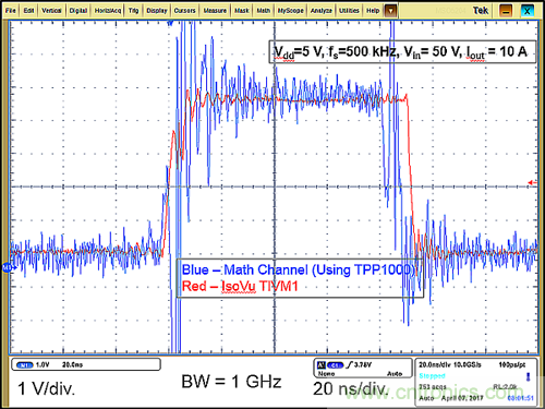 圖5顯示了對(duì)EPC9080板的高側(cè)柵-源極信號(hào)(VGS1)進(jìn)行的示波器數(shù)學(xué)技術(shù)和隔離測量系統(tǒng)之間的測量結(jié)果的差異(圖1)。