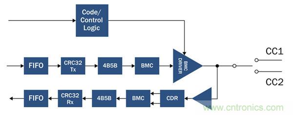 Type-C連接可正反逆插,為用戶帶來了更多的便利,卻使開發(fā)更復(fù)雜。方向通過新的配置通道(CC)管理,該配置通道在連接器上有兩個(gè)專用的引腳,并支持連接的設(shè)備協(xié)商需要提供或汲取多少電源。該通道使用的協(xié)議是一種稱為雙相符號(hào)編碼(BMC)的差分曼徹斯特編碼。USB Implementer Forum(USB-IF)定義了五個(gè)供電配置文件:10W、18W、36W、60W和100 W。使用BMC協(xié)議,電源配置文件可在含USB Type-C接口的兩臺(tái)設(shè)備之間進(jìn)行交換。編碼方案使用轉(zhuǎn)換來表示邏輯電平,而不是絕對(duì)電平,并且它結(jié)合了自己的時(shí)鐘信號(hào),使得同步更簡(jiǎn)單。然而,BMC協(xié)議依賴于一個(gè)物理接口,該接口能在具電氣挑戰(zhàn)的環(huán)境中可靠地解碼信號(hào),而且很少有電氣環(huán)境比車輛環(huán)境更具挑戰(zhàn)性。