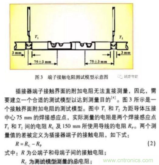 低電平接觸電阻測量法是使用微型歐姆表測試導(dǎo)線壓接和端子接觸區(qū)域的電阻。如圖3所示,使用微型歐姆表測量兩個焊接感應(yīng)點T、T間的電阻和l50mm長度的所使用導(dǎo)線的電阻,據(jù)此可計算出所需要的接觸電阻。