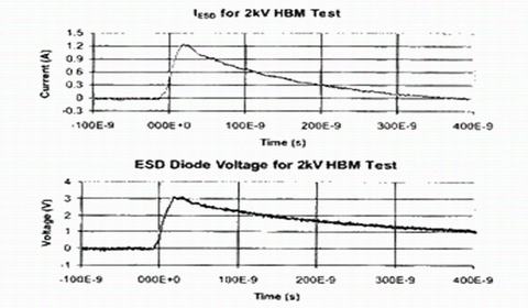 大電流在ESD二極管和引線上產(chǎn)生I-R壓降,該電壓高于二極管本身的壓降。IC可靠性報告中給出了器件設(shè)計所能承受的ESD測試電壓。