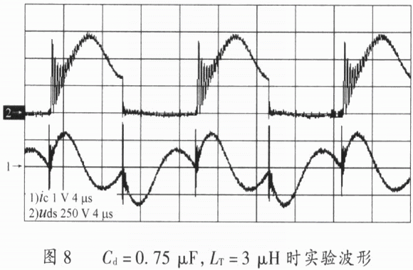圖8中曲線1是流過(guò)IGBT的電流波形,由于電流互感器方向與電流實(shí)際方向相反,所以,與曲線2所示的IGBT兩端電壓uds的波形邏輯相反。