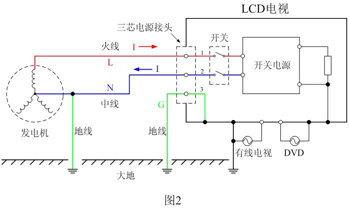 我們舉一個電視機為例,圖2是一個LCD平板電視機與電網(wǎng)正確連接時的工作原理圖。正常工作的時候,三相發(fā)電機(或三相變壓器)中的某一相220伏交流電壓通過火線(L)和中線(N)對LCD電視機進行供電。為了防雷,在發(fā)電機的一端,中線(N)一般都要與大地連接,由于火線(L)與中線(N)一般都是平行排列,當打雷時,雷電會同時打到火線和中線上,由于中線接地,它會把雷電的大部分能量吸收引入地球,僅有少部分能量最后轉成差模信號與輸送電壓混合在一起被傳送到用戶端。
