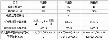 實例:一臺三相三繞組降壓變壓器,容量Se=40.5MVA,電壓110±2×2.5%kV/385±2×2.5%kV/11kV,接線方式:Ydd11-11,變壓器額定電流:213A/608A/2130A。主變差動保護(hù)采用BCH-2型差動繼電器?;居嬎闳绫?所示,已確定110kV側(cè)為基本側(cè)。