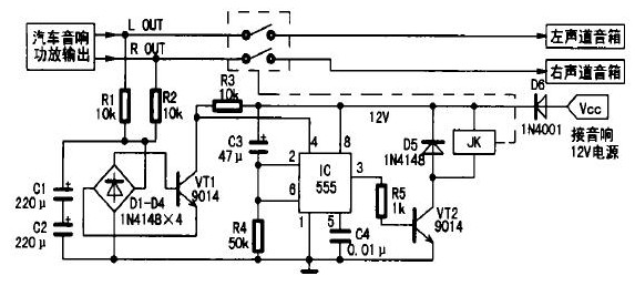 1.在接通音響電源的瞬間,因電容C3兩端電壓不能突變,可視為短路,則時(shí)基電路555的②、⑥腳電位高于2/3 Vcc,故555處于復(fù)位狀態(tài),③腳輸出低電平,晶體管VT2截止,繼電器JK常開觸點(diǎn)不動作。同時(shí)+12 V電壓通過電阻R4向電容C3充電,延時(shí)約5s(秒鐘)后555的②、⑥腳電位降低至1/3Vcc,555被觸發(fā)置位,③腳由低電平變?yōu)楦唠娖?,晶體管VT2導(dǎo)通,繼電器JK得電,常閉觸點(diǎn)閉合,從而實(shí)現(xiàn)了延遲一段時(shí)間將揚(yáng)聲器接入功放,徹底消除了開機(jī)時(shí)大電流對揚(yáng)聲器的沖擊;