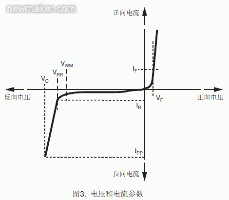 在特定的峰值脈沖電流定額下,TVS上會出現(xiàn)鉗位電壓。TVS的擊穿電壓在非常小的電流下測得(例如1mA或10mA),它不同于應(yīng)用條件下的實際雪崩電壓。因此,半導(dǎo)體制造商所標(biāo)注的是在大電流下的典型或最大擊穿電壓。