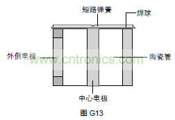 失效保護機構(gòu)是安裝在位于氣體放電管中心電極焊塊上的短路簧片。如圖G12所示,在正常的工作條件下,焊塊使得彈簧片浮在外側(cè)電極之上。當(dāng)長時間放電使氣體放電管溫度達到焊塊的熔點時,焊塊就會被軟化,促使短路彈片被激活,并與兩個外側(cè)電極搭接。這個過程導(dǎo)致三個電極之間永久短路,建立起一條低阻抗路徑,將故障電流引到地面,而不會產(chǎn)生顯著的熱量。