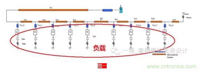 容性負(fù)載?是負(fù)載呈容性,還是帶容性的負(fù)載?呵呵,這不一個(gè)意思嘛,中國(guó)的語(yǔ)言,難怪老外覺(jué)得很難搞懂,自己人都被繞暈了。負(fù)載怎么會(huì)呈容性呢?這個(gè)主要是在多負(fù)載的情況下,如下圖一所示,由于分支和負(fù)載較多,不可避免的會(huì)增加過(guò)孔來(lái)連通信號(hào),普通過(guò)孔是呈容性的,其次還有芯片封裝上的寄生電容(約0.33~0.44pF),另外還有Die上的寄生電容(約0.77~2.12pF),所有的這些電容會(huì)降低信號(hào)線的有效特征阻抗。