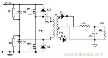 電容器C1和C2與開關(guān)管Q1、Q2組成橋,橋的對角線接變壓器T1的原邊繞組,故稱半橋變換器。如果此時C1=C2,那么當(dāng)某一開關(guān)管導(dǎo)通時,繞組上的電壓只有電源電壓的一半。