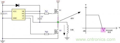 上圖為典型的半橋自舉驅動電路,由于寄生電感的存在,在高端MOS關閉后,低端MOS的體二極管鉗位之前,寄生電感通過低端二極管進行續(xù)流,導致VS端產(chǎn)生負壓,且負壓的大小與寄生電感與成正比關系。該負壓會把驅動的電位拉到負電位,導致驅動電路異常,還可能讓自舉電容過充電導致驅動電路或者柵極損壞。由于IC的驅動端通常都有寄生二極管,當瞬間的大電流流過驅動口的二極管時,很可能引發(fā)寄生SCR閉鎖效應,導致驅動電路徹底損壞。