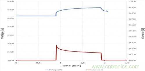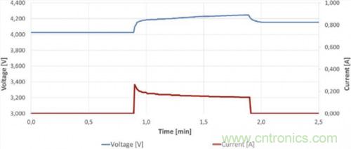 圖6a.6小時后的首個維護(hù)充電脈沖(1分鐘)(90 F 4.2 V系統(tǒng)示例)