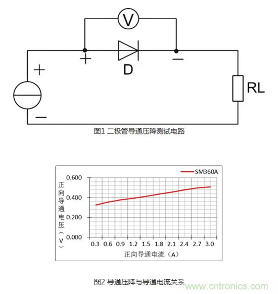 在二極管兩端加正向偏置電壓時(shí),其內(nèi)部電場區(qū)域變窄,可以有較大的正向擴(kuò)散電流通過PN結(jié)。只有當(dāng)正向電壓達(dá)到某一數(shù)值(這一數(shù)值稱為“門檻電壓”,鍺管約為0.2V,硅管約為0.6V)以后,二極管才能真正導(dǎo)通。但二極管的導(dǎo)通壓降是恒定不變的嗎?它與正向擴(kuò)散電流又存在什么樣的關(guān)系?通過下圖1的測試電路在常溫下對型號為SM360A的二極管進(jìn)行導(dǎo)通電流與導(dǎo)通壓降的關(guān)系測試,可得到如圖2所示的曲線關(guān)系:正向?qū)▔航蹬c導(dǎo)通電流成正比,其浮動壓差為0.2V。從輕載導(dǎo)通電流到額定導(dǎo)通電流的壓差雖僅為0.2V,但對于功率二極管來說它不僅影響效率也影響二極管的溫升,所以在價(jià)格條件允許下,盡量選擇導(dǎo)通壓降小、額定工作電流較實(shí)際電流高一倍的二極管。