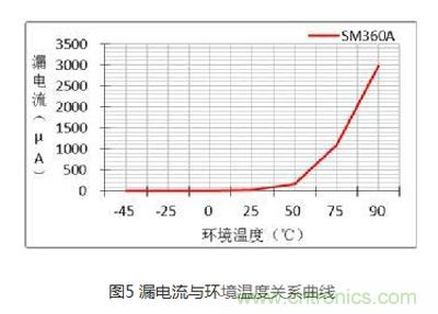 在二極管兩端加反向電壓時(shí),其內(nèi)部電場區(qū)域變寬,有較少的漂移電流通過PN結(jié),形成我們所說的漏電流。漏電流也是評估二極管性能的重要參數(shù),二極管漏電流過大不僅使其自身溫升高,對于功率電路來說也會影響其效率,不同反向電壓下的漏電流是不同的,關(guān)系如圖4所示:反向電壓愈大,漏電流越大,在常溫下肖特基管的漏電流可忽略。