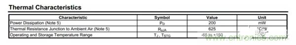 從中可知,其耗散功率PD=200mW,熱阻為625℃/W,其中這兩個(gè)量是環(huán)境溫度25℃,焊在FR-4材質(zhì) PCB條件下測(cè)試的,如手冊(cè)說明Part mounted on FR-4 PC board with recommended layout 。