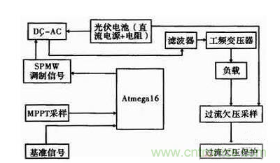 設計采用Atmega16單片機為主體控制電路,工作過程為:與基準信號同頻率、同相位正弦波經(jīng)過SPWM調制后,輸出正弦波脈寬調制信號,經(jīng)驅動電胳放大,驅動H橋功率管工作,經(jīng)過濾波器和工頻變壓器產(chǎn)生于基準信號通頻率、同相位的正弦波電流。其中,過流、欠壓保護由硬件實現(xiàn),同步信號采集、頻率的采集、控制信號的輸出等功能,均由Atmega16完成。系統(tǒng)總體設計框圖如圖1所示。