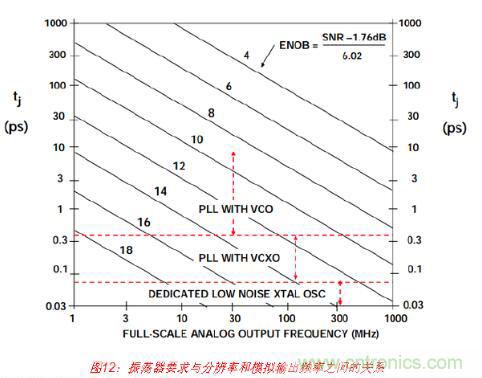 圖12顯示的是與圖10相同的數(shù)據(jù),但其中針對各種分辨率要求繪制出與模擬輸出頻率成 函數(shù)關(guān)系的最大允許抖動。根據(jù)最大輸出頻率和ENOB中所需分辨率來選擇采樣時(shí)鐘發(fā)生 器類型,應(yīng)以此圖片作為大概準(zhǔn)則。具有標(biāo)準(zhǔn)VCO的PLL方法就是產(chǎn)生采樣時(shí)鐘的一種 不錯(cuò)方式,其中均方根(RMS)抖動要求大約為1 ps或以上。不過,亞皮秒抖動要求采用基 于VCXO的PLL或?qū)S玫驮肼暰w振蕩器。“教程MT-008”介紹了如何將振蕩器相位噪聲轉(zhuǎn) 換成抖動。