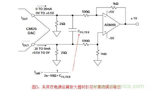但是應(yīng)注意,與差分工作模式相比,以這種方式使用DAC的單端輸出時(shí),共模抑制性能將 下降,且2階失真產(chǎn)物將增加。