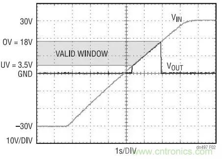 圖 2 示出了圖 1 電路中的 VIN 從 –30V 緩慢斜坡上升 至 30V 時做出的反應(yīng)。UV 和 OV 門限被分別設(shè)定為 3.5V 和 18V。當(dāng)電源電壓位于 3.5V 至 18V 窗口之內(nèi) 時, VOUT 跟隨 VIN 。若超出該窗口時,LTC4365 將 關(guān)斷 N 溝道 MOSFET,并使 VOUT 與 VIN 斷接,即使 在 VIN 為負(fù)值的情況下也不例外。