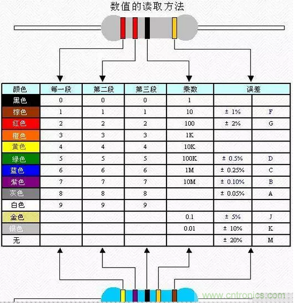 黑-0、棕-1、紅-2、橙-3、黃-4、綠-5、藍(lán)-6、紫-7、灰-8、白-9、金-±5%、銀-±10%、無(wú)色-±20%