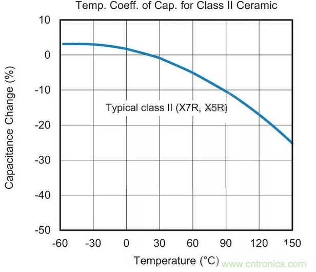 用于替換最可能的MLCC候選者采用“II類”電介質(zhì)材料。這種II類陶瓷(通常為X7R或X5R)的容值會(huì)在溫度范圍內(nèi)變化,這種特征稱為電容溫度系數(shù)(TCC),參見圖1。