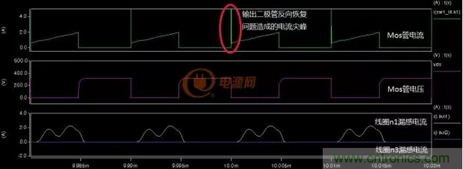 其次反激變壓器在連續(xù)模式下其輸出二極管有反向恢復(fù)問(wèn)題,見(jiàn)下圖:
