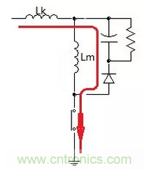假設(shè)初級(jí)兩線圈耦合的好,當(dāng)開(kāi)關(guān)關(guān)閉時(shí)上圖中的(a)就等效于圖(b)其結(jié)果為主電感被免疫掉了,換言之電容Cm只吸收漏感能量不吸收主電感能量。
