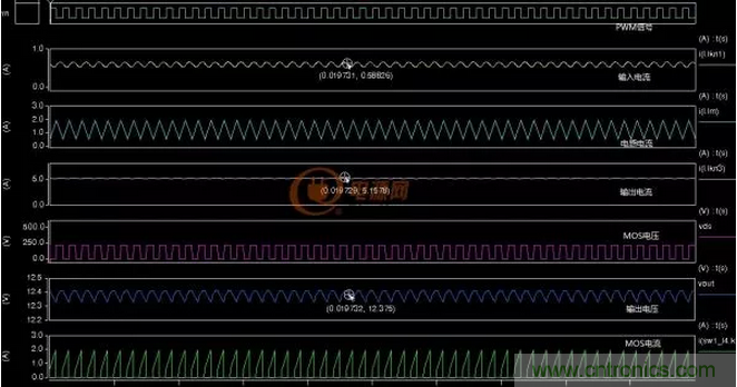 仿真的電路中二極管管壓降為0.3V元器件直流阻抗1m歐,忽略開(kāi)關(guān)損耗及磁芯損耗,從仿真結(jié)果看效率可以達(dá)到95%左右。