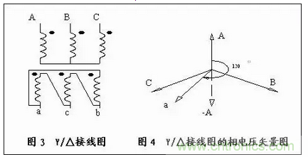 如要識(shí)別圖3所示的Y/△接法的聯(lián)接組別,首先畫出原邊相電壓矢量A、B、C,根據(jù)圖3的接線圖可以看出,次邊a相繞組的尾連接C相繞組的頭作為次邊a相的輸出線,由于次邊a與原邊A同相位,我們把次邊a相相電壓矢量畫在原邊相電壓C和-A的中間,以原邊A相為基準(zhǔn),順時(shí)針旋轉(zhuǎn)次邊a相,它們之間的夾角為210°,由此這個(gè)接線圖是Y/△-7組,見圖4。
