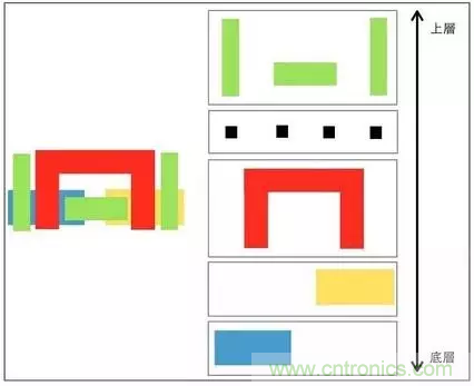 首先,目前已經(jīng)知道一顆 IC 會(huì)產(chǎn)生多張的光罩,這些光罩有上下層的分別,每層有各自的任務(wù)。下圖為簡(jiǎn)單的光罩例子,以積體電路中最基本的元件 CMOS 為範(fàn)例,CMOS 全名為互補(bǔ)式金屬氧化物半導(dǎo)體(Complementary metal–oxide–semiconductor),也就是將 NMOS 和 PMOS 兩者做結(jié)合,形成 CMOS。至于什么是金屬氧化物半導(dǎo)體(MOS)?這種在芯片中廣泛使用的元件比較難說(shuō)明,一般讀者也較難弄清,在這裡就不多加細(xì)究。