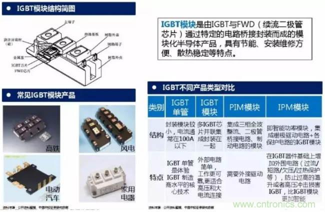 IGBT模塊是由IGBT與FWD(續(xù)流二極管芯片)通過特定的電路橋接封裝而成的模塊化半導體產品,具有節(jié)能、安裝維修方便、散熱穩(wěn)定等特點。