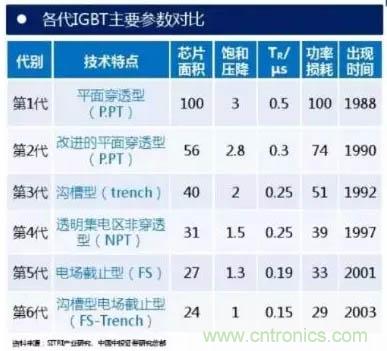 1985年前后美國GE成功試制工業(yè)樣品(可惜后來放棄)。自此以后, IGBT主要經歷了6代技術及工藝改進。