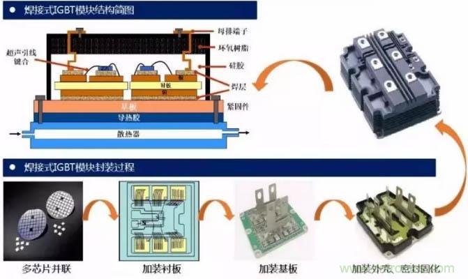 IGBT模塊按封裝工藝來看主要可分為焊接式與壓接式兩類。高壓IGBT模塊一般以標準焊接式封裝為主,中低壓IGBT模塊則出現了很多新技術,如燒結取代焊接,壓力接觸取代引線鍵合的壓接式封裝工藝。