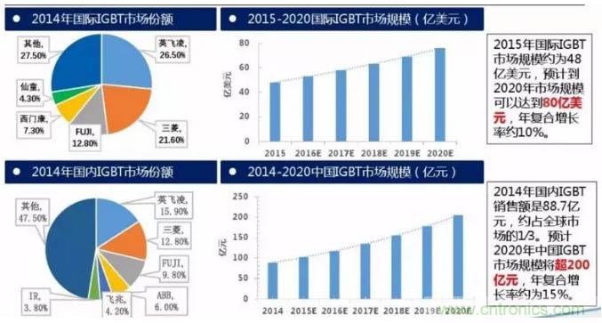 2015年國際IGBT市場規(guī)模約為48億美元,預計到2020年市場規(guī)??梢赃_到80億美元,年復合增長率約10%。2014年國內IGBT銷售額是88.7億元,約占全球市場的1∕3。預計2020年中國IGBT市場規(guī)模將超200億元,年復合增長率約為15%。