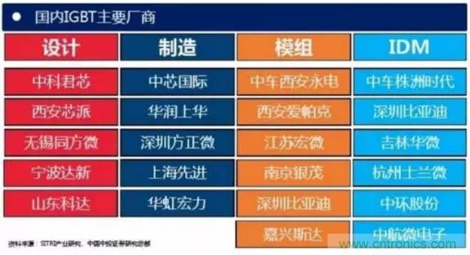 從公司來看,國外研發(fā)IGBT器件的公司主要有英飛凌、 ABB、三菱、西門康、東芝、富士等。中國功率半導體市場占世界市場的50%以上,但在中高端MOSFET及IGBT主流器件市場上,90%主要依賴進口,基本被國外歐美、日本企業(yè)壟斷。