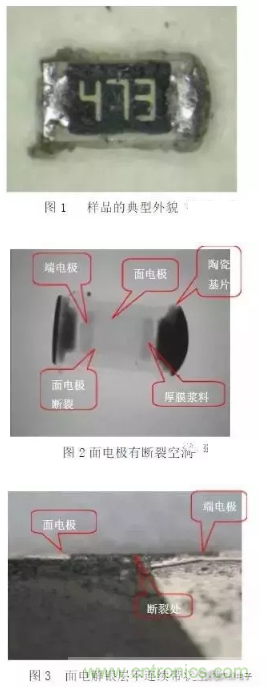 1) 開(kāi)路:主要失效機(jī)理為電阻膜燒毀或大面積脫落,基體斷裂,引線帽與電阻體脫落。