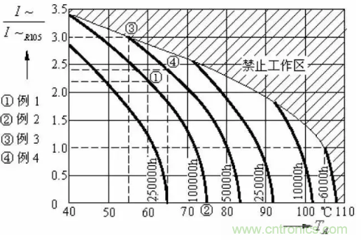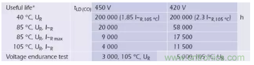 溫度、電壓、紋波電流共同作用對(duì)壽命的影響。以某電子鎮(zhèn)流器用鋁電解電容器為例。在不同的電壓與溫度條件下的鋁電解電容器壽命不同。