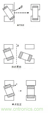 當(dāng)貼片時(shí),由于焊墊的不平或焊膏的滑動(dòng),造成片感偏移了θ角。由于焊墊熔融時(shí)產(chǎn)生的潤(rùn)濕力,可能形成以上三種情況,其中自行歸正為主,但有時(shí)會(huì)出現(xiàn)拉的更斜,或者單點(diǎn)拉正的情況,片感被拉到一個(gè)焊盤上,甚至被拉起來(lái),斜立或直立(立碑現(xiàn)象)。目前帶θ角偏移視覺(jué)檢測(cè)的貼片機(jī)可減少此類失效的發(fā)生。