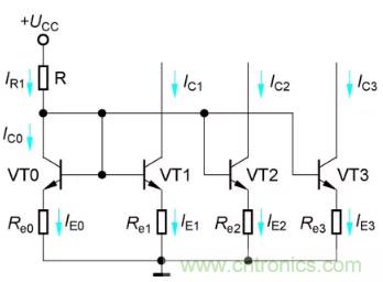 圖4所示電路是在比例恒流源基礎(chǔ)上得到的多路恒流源電路,IR為基準(zhǔn)電流,IC1、IC2和IC3為三路輸出電流。由于各管的b-e間電壓UBE數(shù)值大致相等,因此可得近似關(guān)系