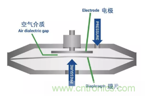 簡單地說,這些壓力傳感器是一種電容器,一種具有充電能力的裝置。當(dāng)壓力作用到傳感器內(nèi)部的膜片上時,膜片就會收縮,或向固定電極彎曲,并改變電容。這種物理變化會導(dǎo)致電子輸出的變化,該裝置可將壓力讀數(shù)轉(zhuǎn)換成電流或電壓值。