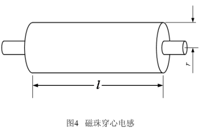 穿心電感的電感量一般都比較小,大約在幾微亨到幾十微亨之間,電感量大小與穿心電感中導線的大小以及長度,還有磁珠的截面積都有關系,但與磁珠電感量關系最大的還要算磁珠的相對導磁率 。圖3、圖4是分別是指導線和穿心電感的原理圖,計算穿心電感時,首先要計算一根圓截面直導線的電感,然后計算結果乘上磁珠相對導磁率