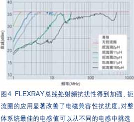 物理層應(yīng)用指南明確指出了對FlexRay網(wǎng)絡(luò)數(shù)據(jù)線扼流圈的總體要求,比如引線電阻(<1W)、電感(>50mH)以及雜散電感(<1mH)。對電磁輻射和電磁干擾的測定與CAN總線一樣。不過,由于10Mbit/s的更高傳輸率,需要更加仔細地檢查信號完整性。圖4所示為對具有各種電感的扼流圈與不使用扼流圈的測試板進行DPI測定的相應(yīng)評估結(jié)果。圖五所示為使用另一塊測試板進行電磁干擾測量的結(jié)果,同樣是針對具有不同電感的扼流圈。很明顯可以發(fā)現(xiàn),數(shù)據(jù)線扼流圈的使用改善了電磁兼容性并減少了干擾輻射。當電感更高時,作用就更大。不過,更高的電感值會對信號完整性產(chǎn)生一定的負面影響。[page]
